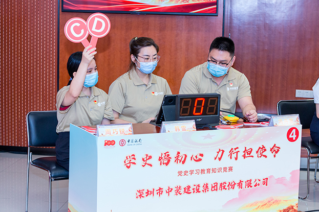 活動伊始,中裝建設(shè)副總裁黎文崇同志在致辭中強調(diào),此次黨史競賽活動,既是貫徹落實黨中央黨史學(xué)習(xí)教育決策部署的一次具體行動,也是中裝建設(shè)與中國銀行深圳中心區(qū)支行、深圳市物業(yè)專項維修資金管理中心、深圳市公證書等參賽單位構(gòu)建“黨建同心圓”的一次嘗試,有效促進了彼此的溝通交流。希望中裝建設(shè)以此次活動為契機,進一步加深與中國銀行深圳中心區(qū)支行、物業(yè)專項維修資金管理中心以及市深圳公證處的合作,共同推動黨建和事業(yè)邁上新的臺階,以優(yōu)異的成績慶祝建黨100 周年。
